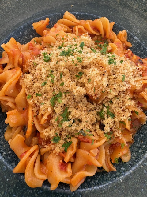 For lunch I chose the Sapori Siculi, a vegetarian pasta dish with Sicilian pesto (yum), sun dried tomatoes, garlic, basil, pine nuts, raisins and almonds, and something called muddica atturrata. That’s apparently a Sicilian version of toasted breadcrumbs.